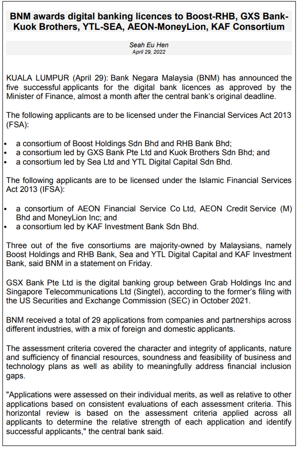 Solved Bnm Awards Digital Banking Licences To Boost Rhb Gxs Chegg Com